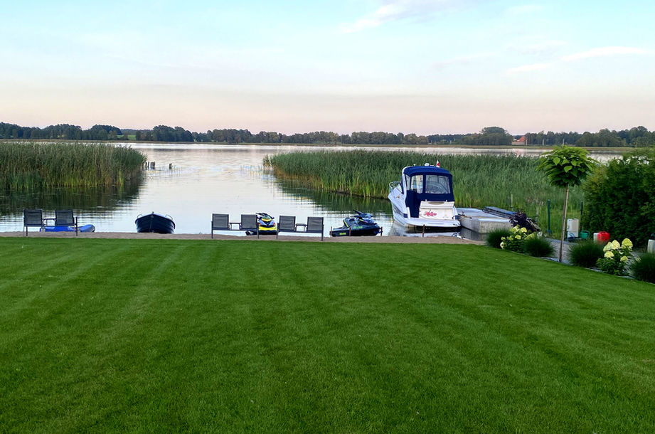 Widok na jezioro i mazurską przyrodę prosto z terenu obiektu – przestrzeń, cisza i natura bez tłumów.